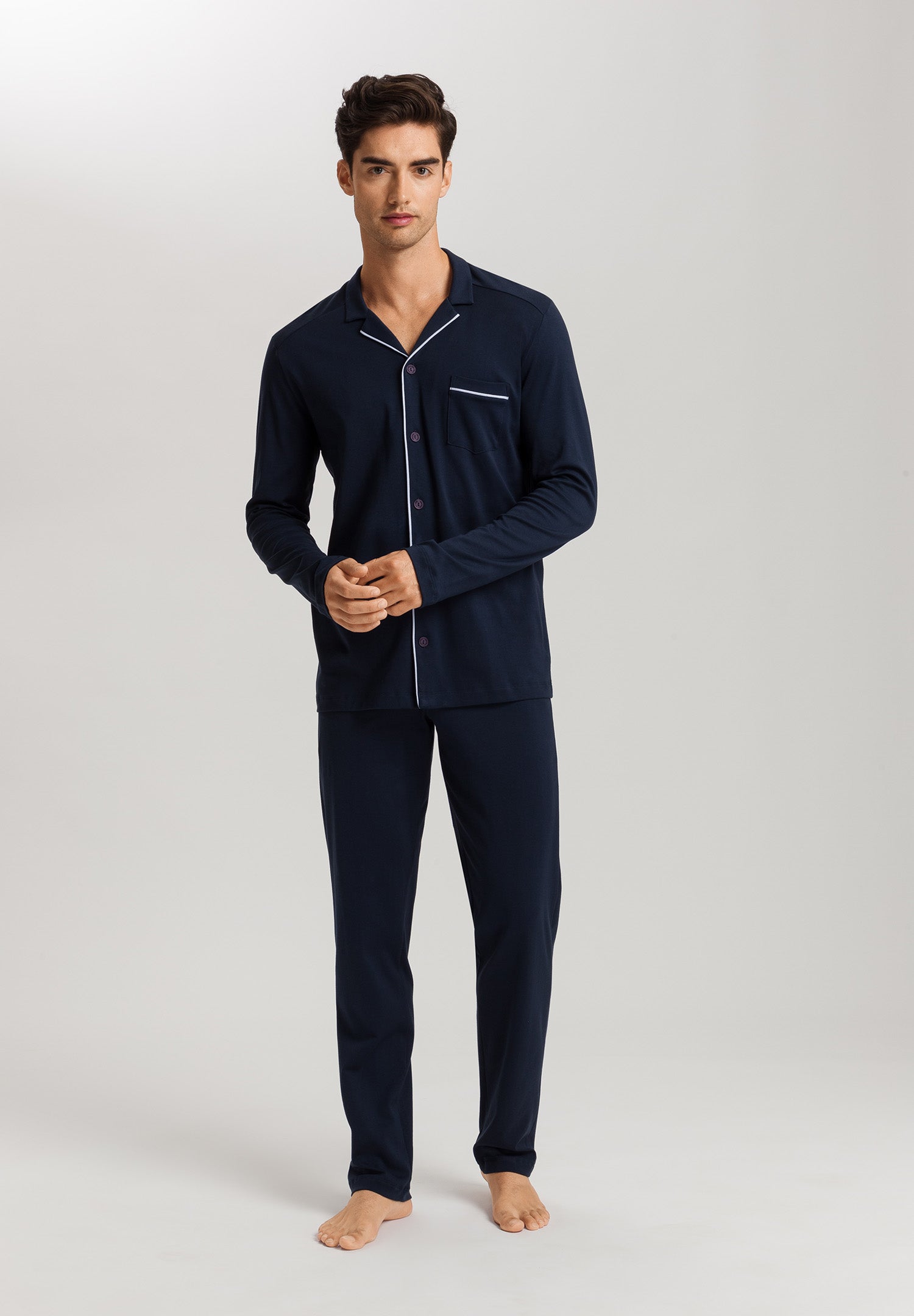 Der HANRO Men Pyjama aus der Serie Night & Day vereint klassischen Komfort mit modernem, sportlich-elegantem Look. Gefertigt aus hochwertiger Baumwolle, bietet das Shirt mit langem Arm und die passende Hose ein besonders weiches, atmungsaktives Tragegefühl – ideal für entspannte Nächte und gemütliche Stunden zu Hause.