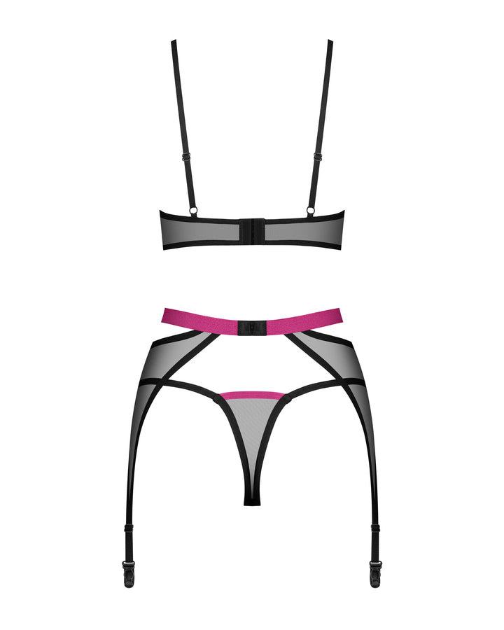 Gönnen Sie sich pure Eleganz mit diesem schwarzen, transparenten Mesh-Ensemble, bestehend aus Strapsgürtel, BH und String. Die universell schmeichelnde Passform und moderne, glänzende Details ziehen garantiert alle Blicke auf sich. Perfekt für ein romantisches Rendezvous und besondere Momente.